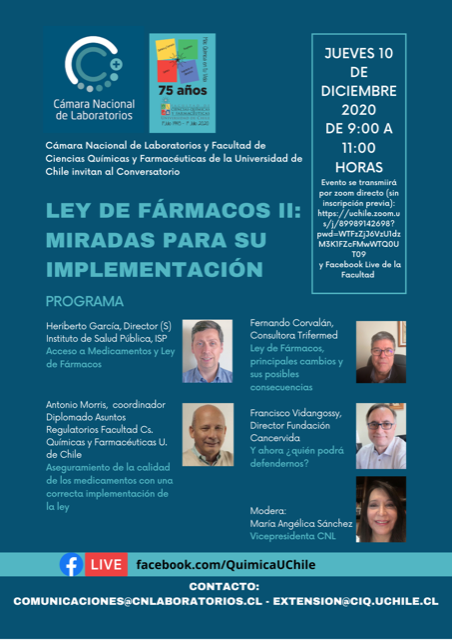 La Cámara Nacional de Laboratorios A.G. y la Facultad de Ciencias Químicas y Farmacéuticas de la Universidad de Chile realizarán el primer Conversatorio virtual “Ley de Fármacos II: Miradas para su Implementación” que se efectuará vía zoom y redes sociales el próximo jueves 10 de diciembre, de 9:00 a 11:00 horas.